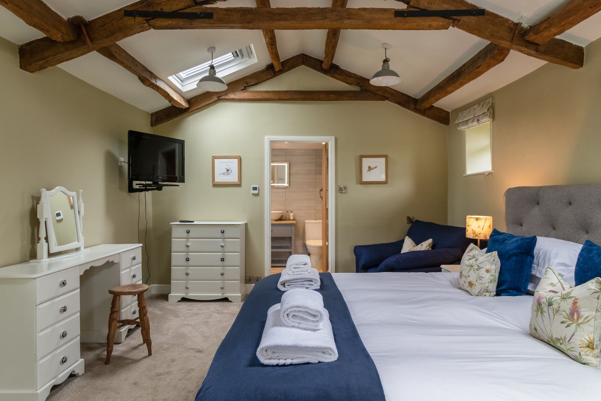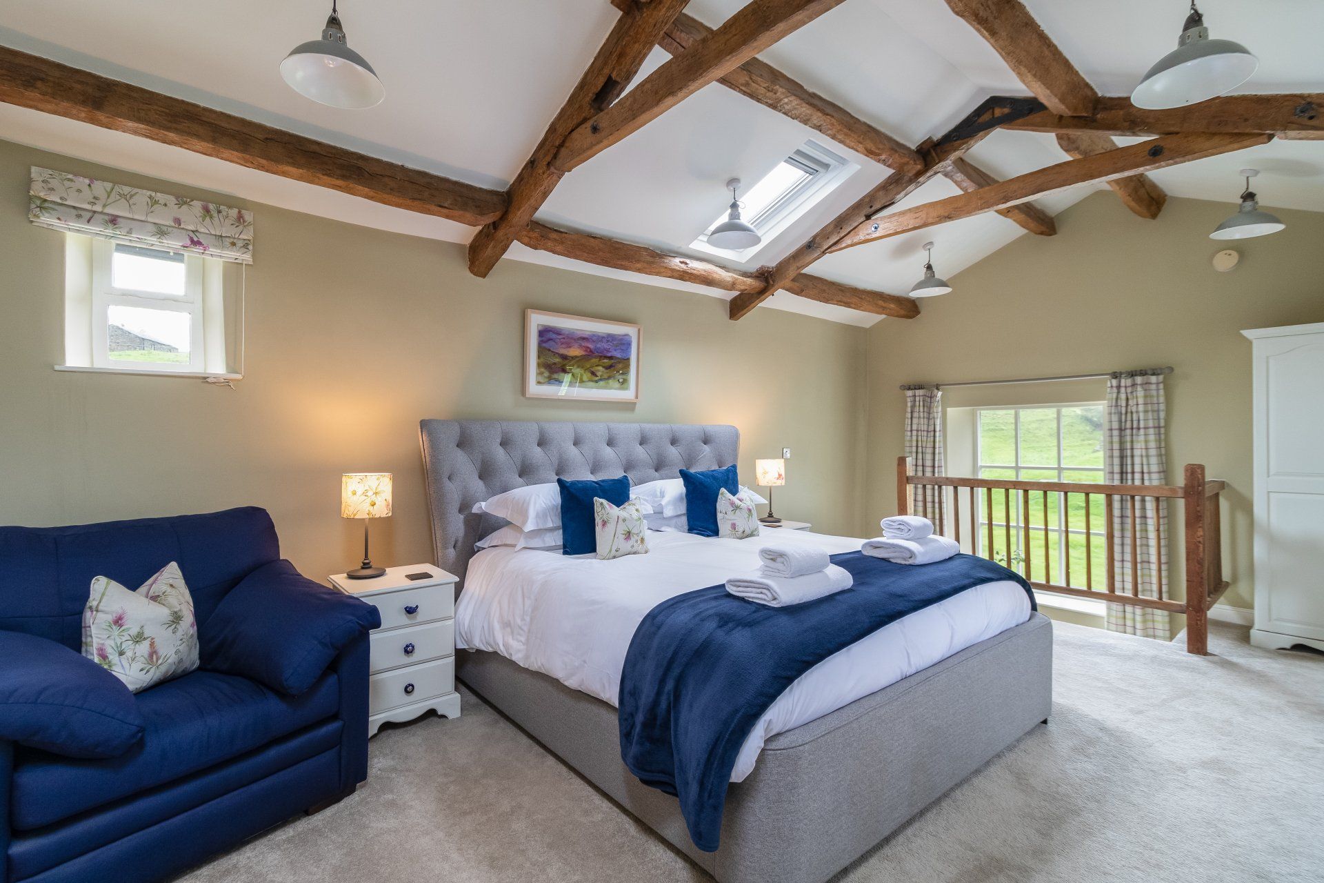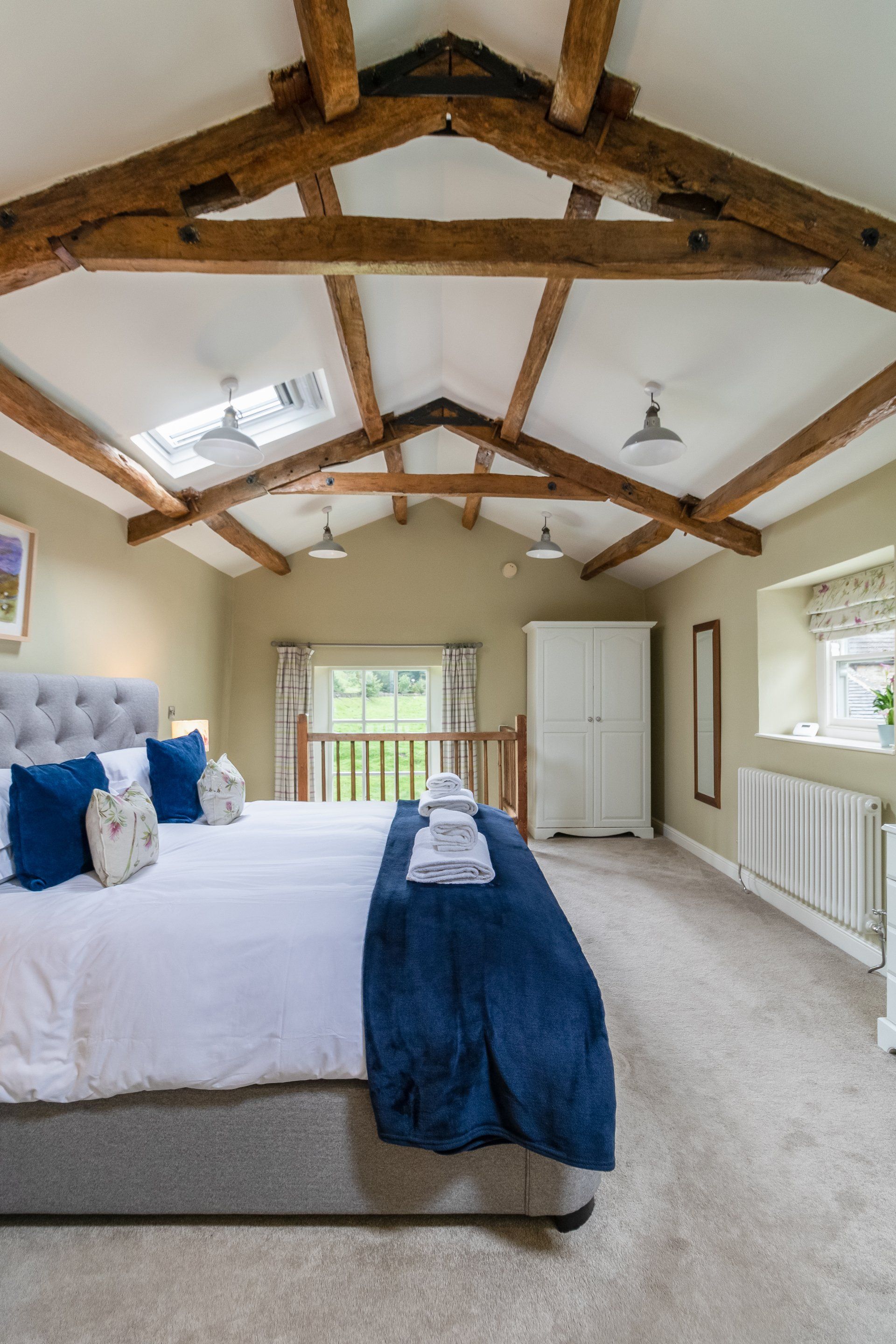 - Upstairs to the huge super king bedroom; vaulted ceiling; luxurious Egyptian cotton bedding