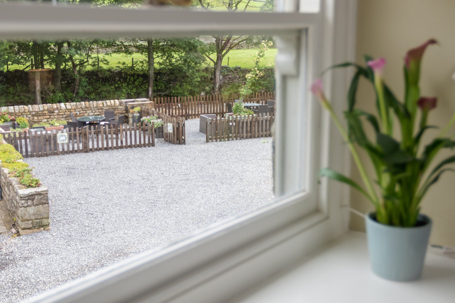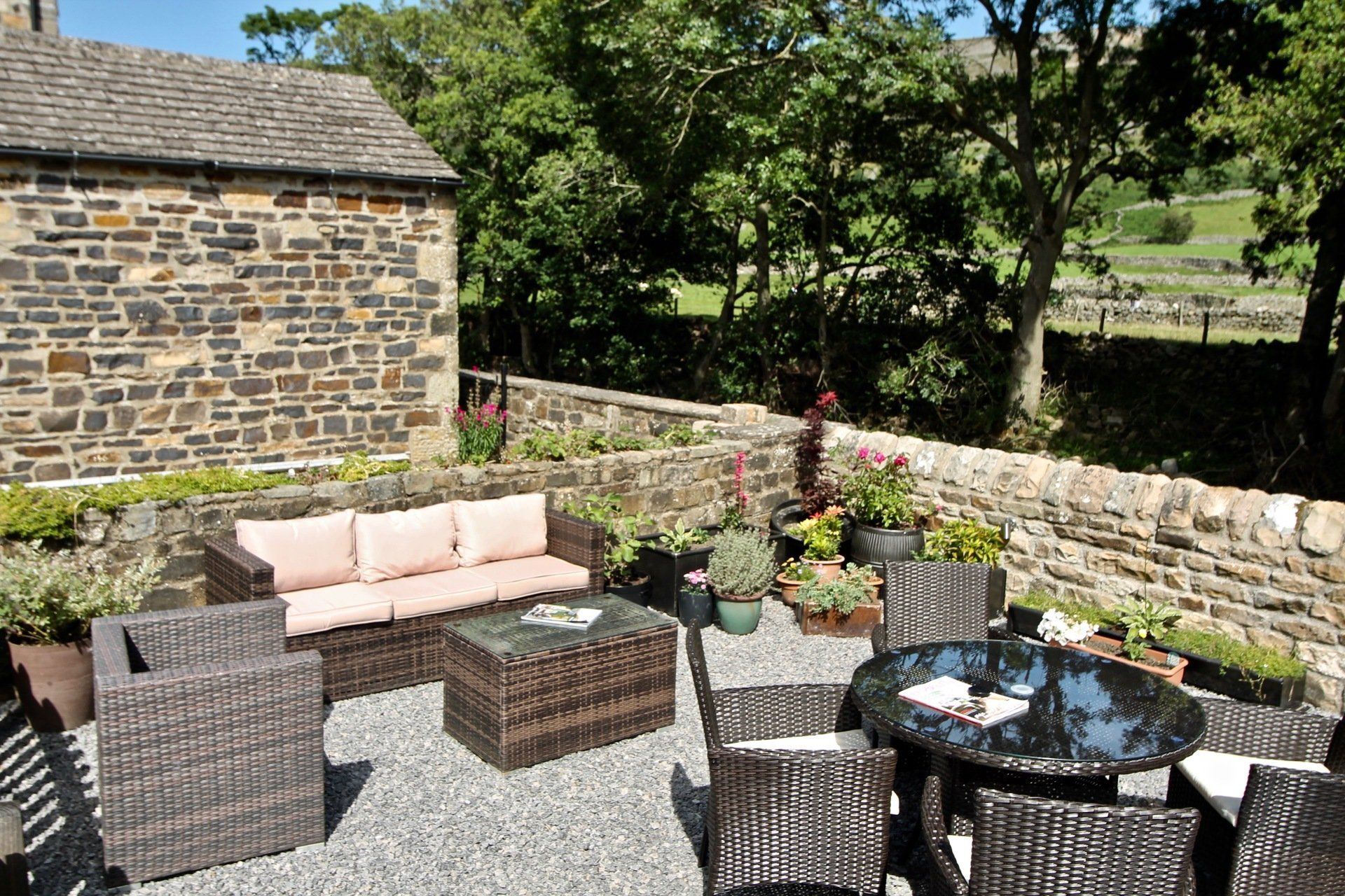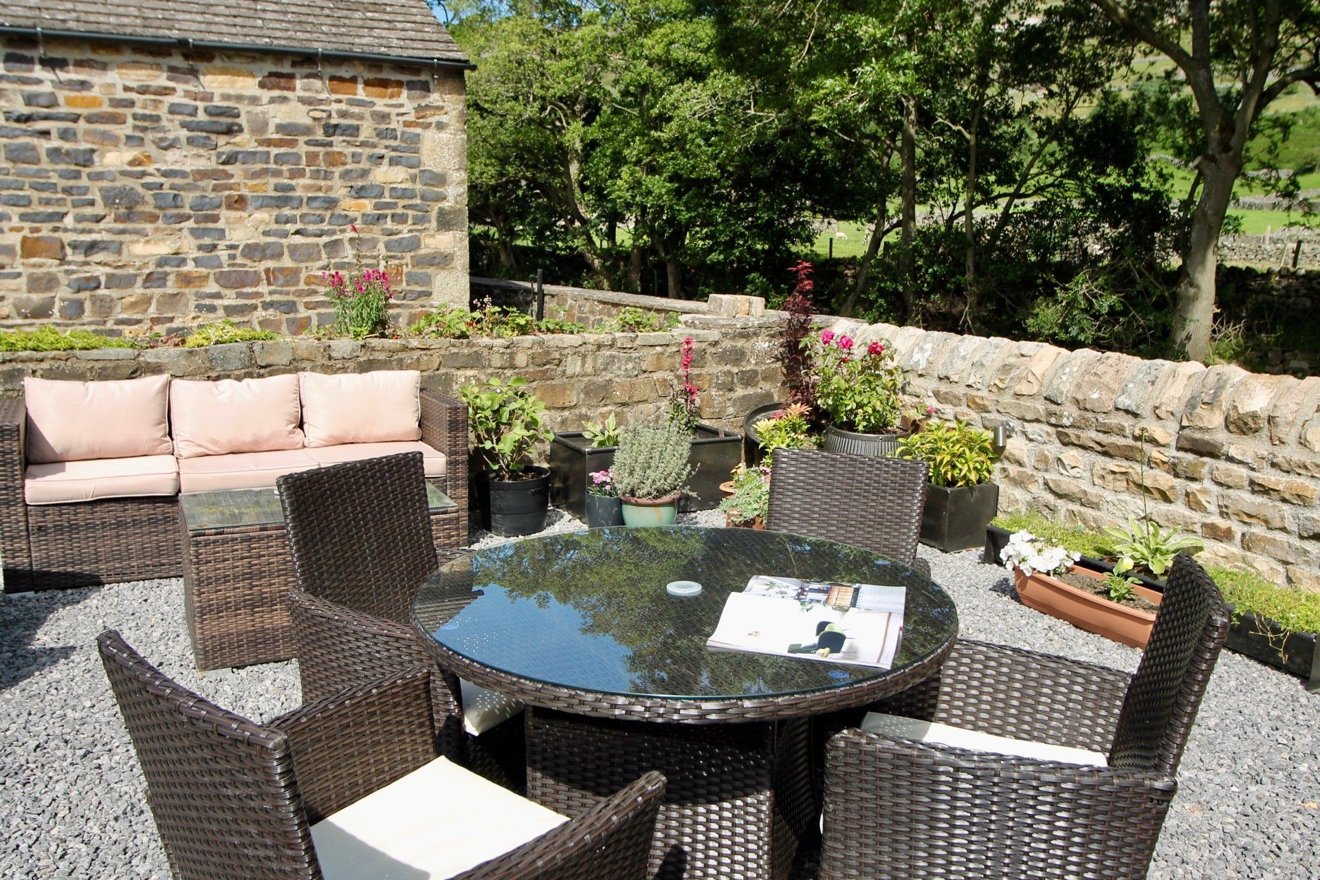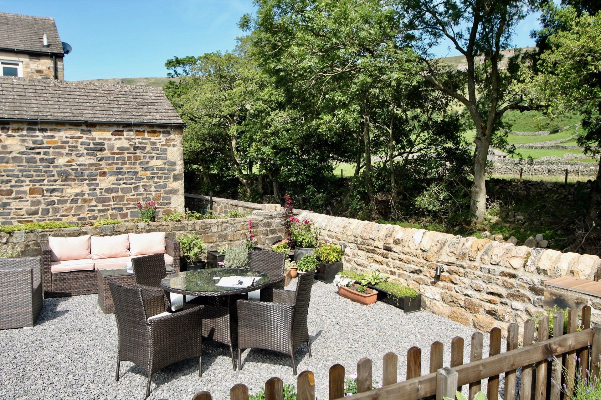 - Riverside garden with table and chairs; comfy seating; a parasol for sunnier days
