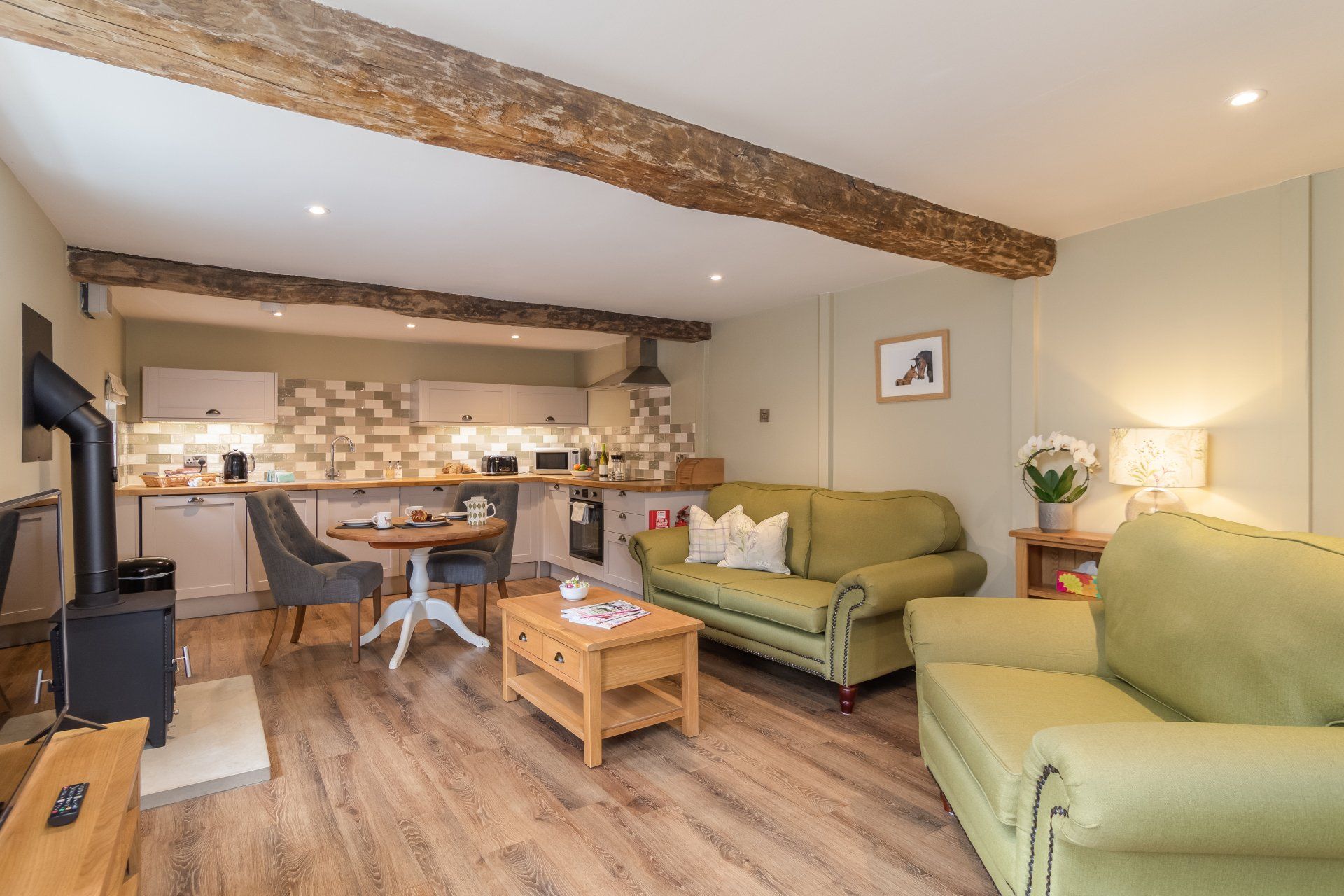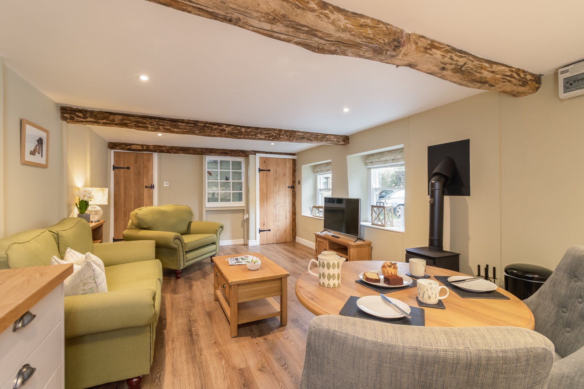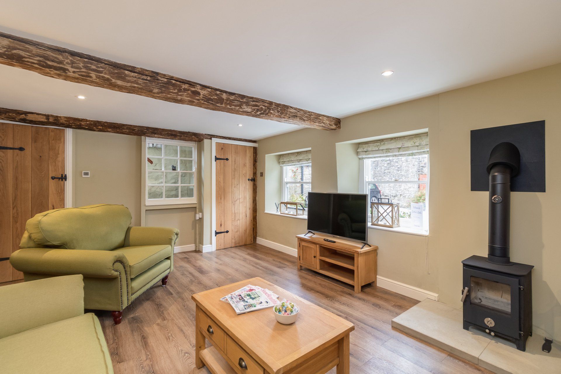 - Open plan downstairs with original beams, sofas, Smart TV, log burning stove.