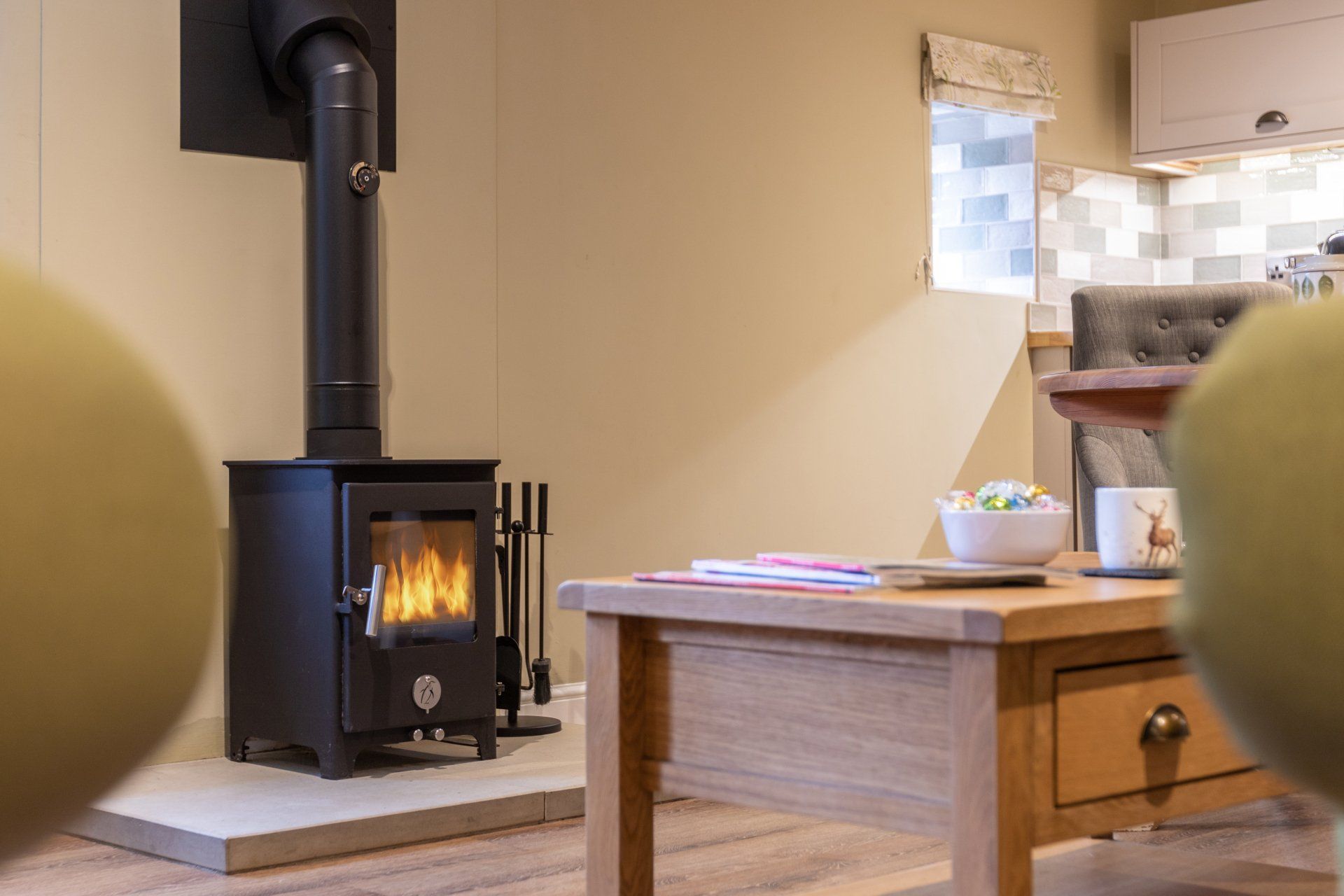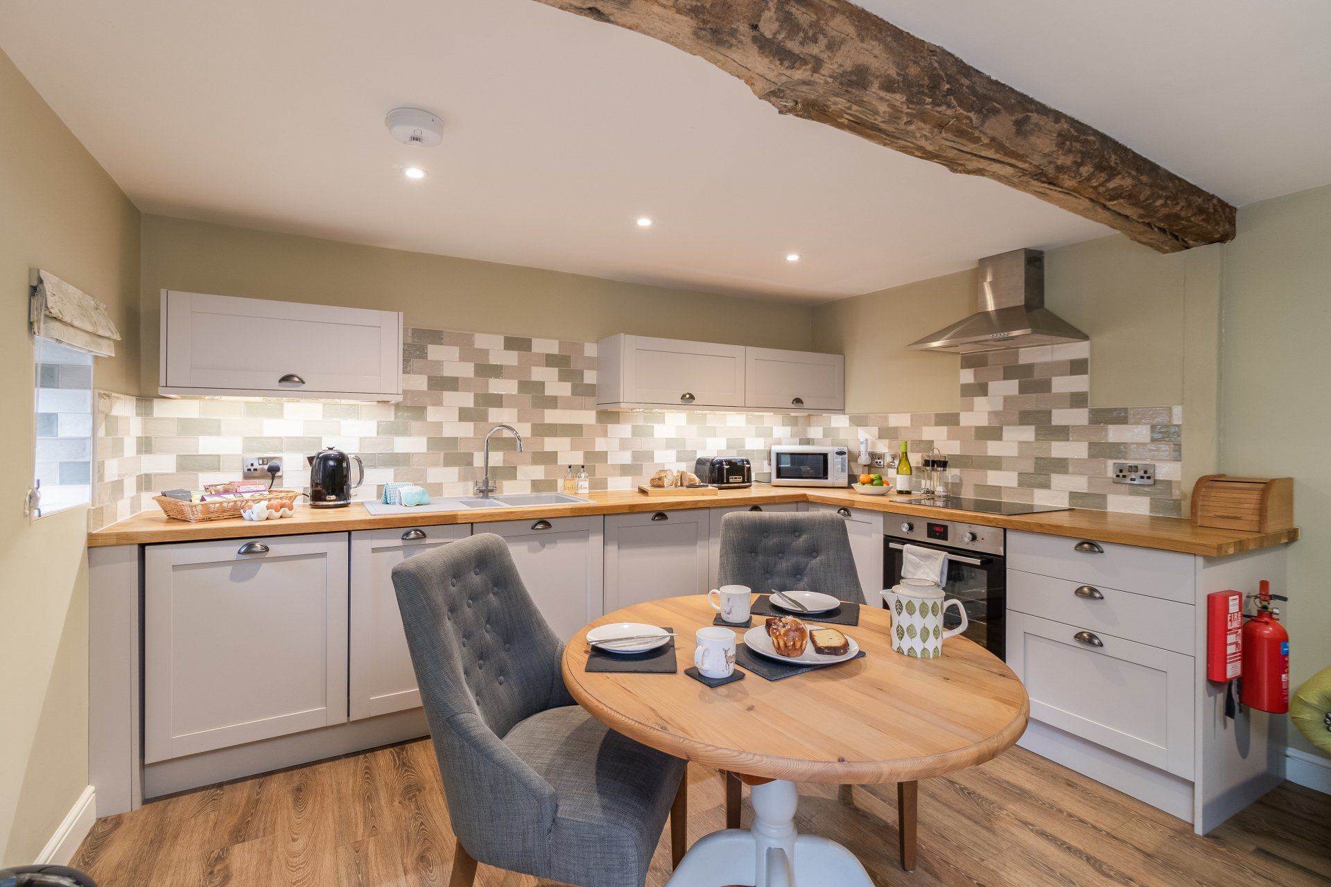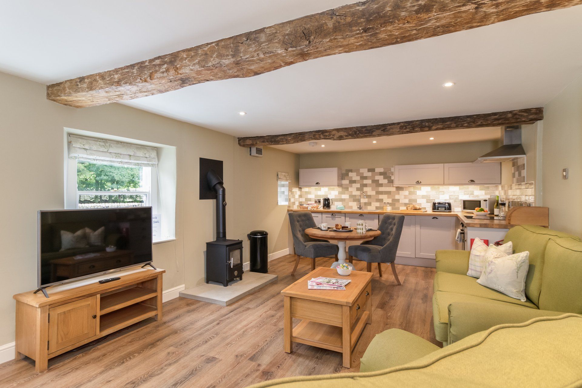- Open plan downstairs with original beams, sofas, Smart TV, log burning stove.